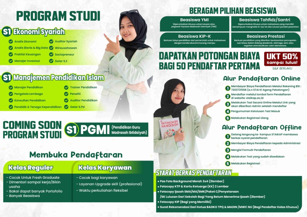 Sebagai bentuk komitmen dalam membuka akses pendidikan seluas-luasnya, STAI KI Ageng Pekalongan memberikan potongan Uang Kuliah Tunggal (UKT) sebesar 50 persen hingga lulus bagi 50 pendaftar pertama, dengan syarat dan ketentuan berlaku.