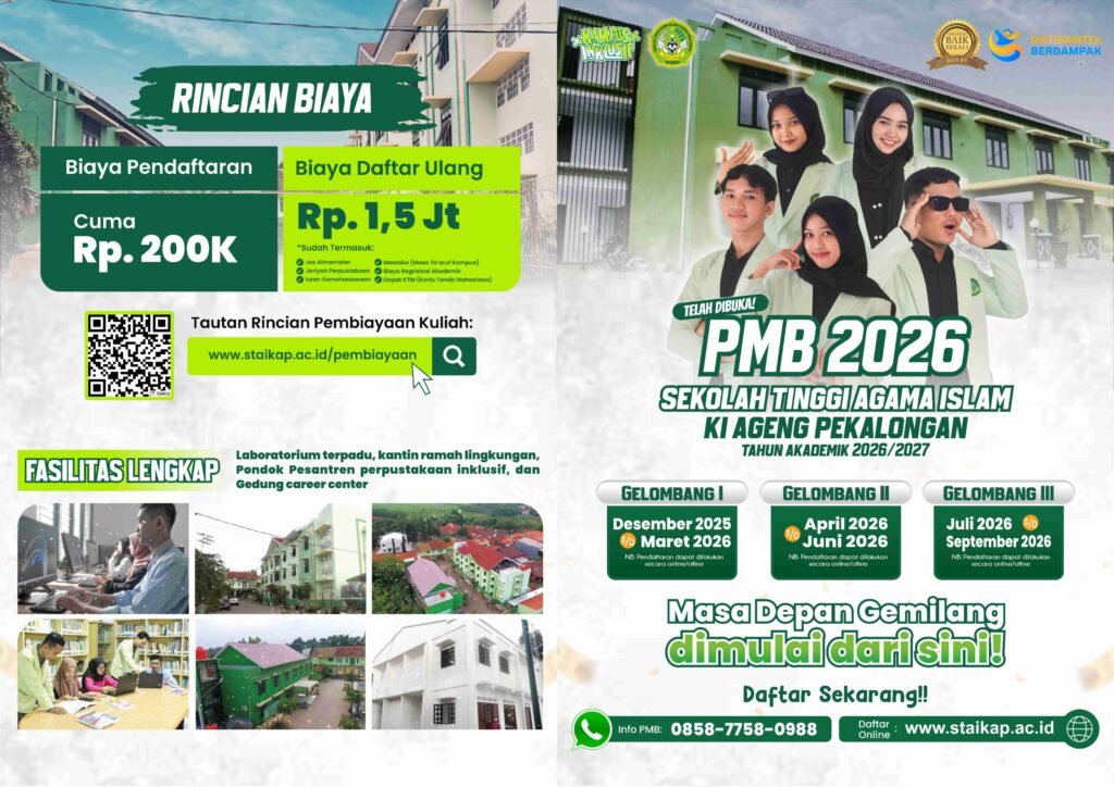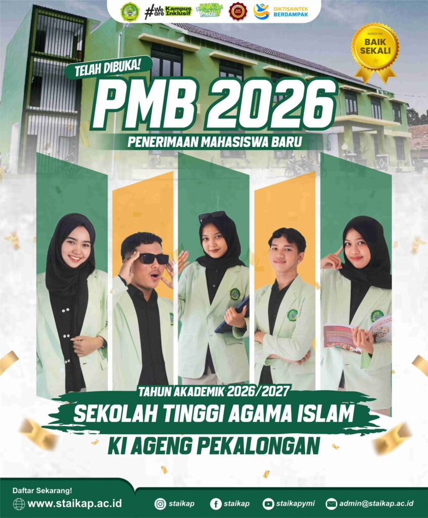 Pekalongan — Sekolah Tinggi Agama Islam (STAI) KI Ageng Pekalongan secara resmi membuka Penerimaan Mahasiswa Baru (PMB) Tahun Akademik 2026/2027. Kampus yang mengusung semangat We Are Kampus Inklusif ini kembali menghadirkan berbagai kemudahan dan program unggulan bagi calon mahasiswa.